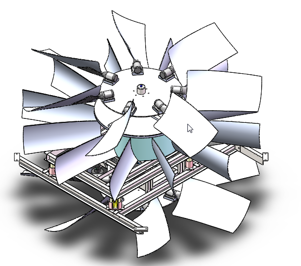 風機設計為大弦角大風量低速型三層風機,風機直徑Φ2850mm,葉片數量7片,轉速設定為100rpm,葉片采用航空鋁合金板材,可進行無級調節角度。因風機設計為寬葉葉片,低轉速運行時具有風量大、全壓高、效率高、噪音低、傳動平穩等優點。而且其氣動性能好、高強度、耐腐蝕,并可通過改變葉片安放角度方法滿足工藝要求及提高裝置效率。