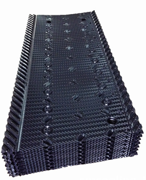 懸掛式高效橫流塔專用填料,該填料采用改性阻燃PVC經真空吸塑而成,其氧指數達到33,達到國際B1級難燃標準,在65℃水溫中不變形,可在50℃下長期穩定的工作。波高20mm,該填料獨有的自帶高效收水器和導風裝置設計,保證熱交換率,并將漂水損失控制到小于循環水量的0.001%。解決了傳統填料采用膠水粘接導致變脆、易堵塞、難清洗、漂水率高等缺點,從而大大提高了填料的使用壽命。